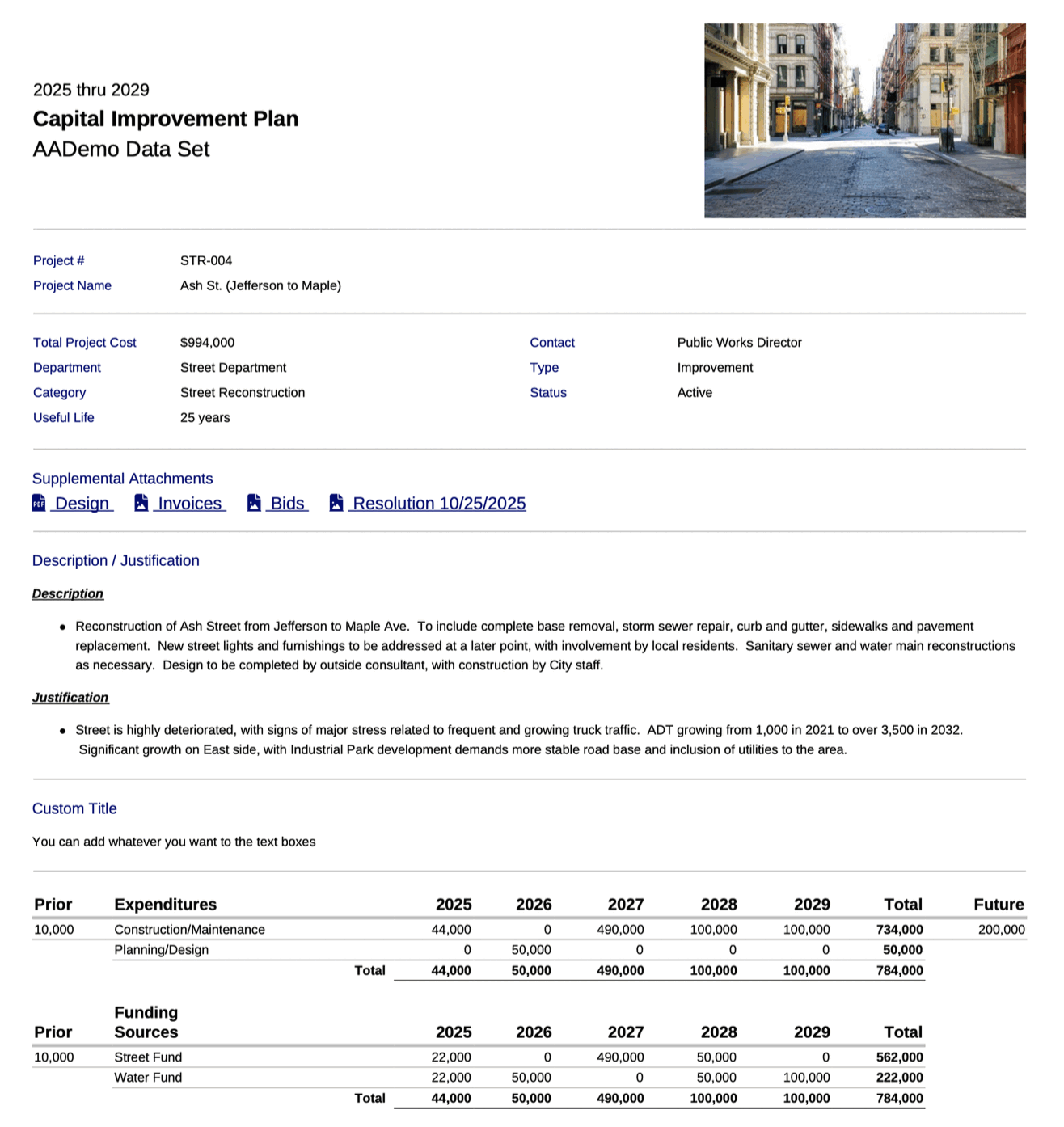 Our software simplifies the management of your CIP by centralizing your data in one place. Adding or editing projects is a breeze! With a simple click of a button you can move from one year to the next. With our extensive selection of customizable reports, you'll have all the information you need to prioritize and fund projects.